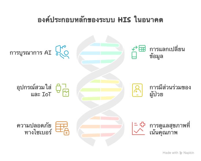จะเห็นได้ว่า ระบบ HIS ไม่เพียงแต่ช่วยให้โรงพยาบาลทำงานได้อย่างเป็นระบบและปลอดภัย แต่ยังเป็นกลไกสำคัญในการยกระดับมาตรฐานการรักษาในอนาคต ทั้งการใช้ AI เพื่อวิเคราะห์ การแลกเปลี่ยนข้อมูลสุขภาพแบบไร้รอยต่อ การรองรับอุปกรณ์สวมใส่ IoT รวมถึงการสร้างการมีส่วนร่วมของผู้ป่วย ขณะเดียวกันระบบยังคงพัฒนาเรื่อง ความปลอดภัยและการดูแลสุขภาพที่เน้นคุณค่า (Value-Based Care) เพื่อมุ่งสู่การรักษาที่มีประสิทธิภาพและยั่งยืนอย่างแท้จริง