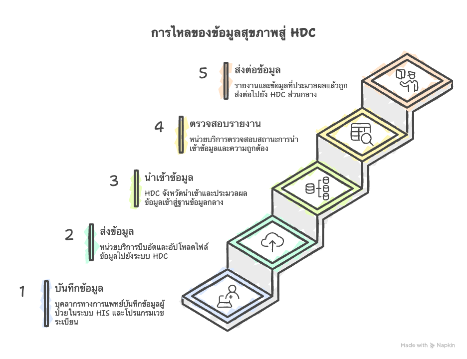 การไหลของข้อมูลจากหน่วยบริการสาธารณสุขสู่ระบบ HDC เป็นกระบวนการสำคัญในการจัดการข้อมูลสุขภาพของประชาชน โดยมีเป้าหมายเพื่อให้ข้อมูลสุขภาพถูกเก็บอย่างเป็นระบบ สะท้อนสถานการณ์สุขภาพจริง และนำไปวิเคราะห์ วางแผน และประเมินผลการให้บริการได้อย่างถูกต้อง